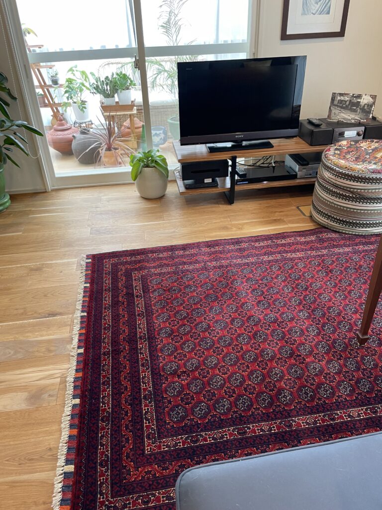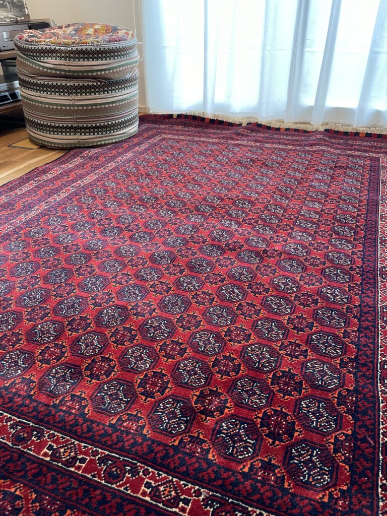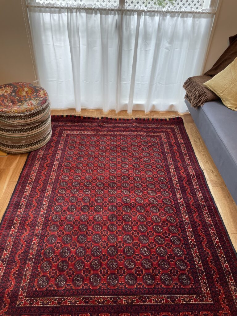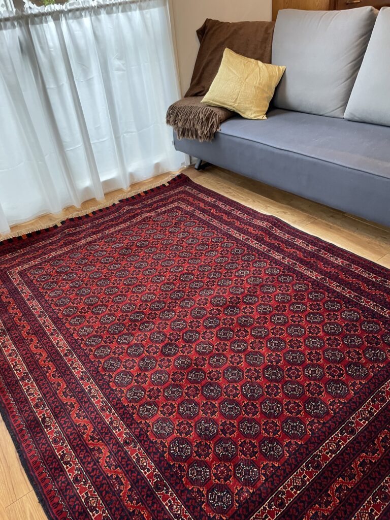 お客様宅に納品されたアフガン絨毯と、窓から差し込む自然光の柔らかな風景 ブログ