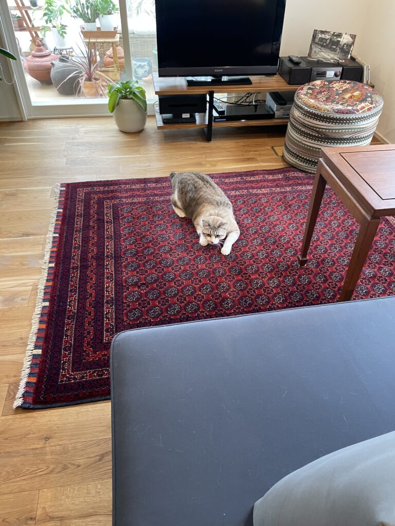 敷いた瞬間、真っ先にくつろいでくれたのは、家族同然の猫ちゃん。ふかふかのウールの感触に、居心地の良さを感じてくれたようです。